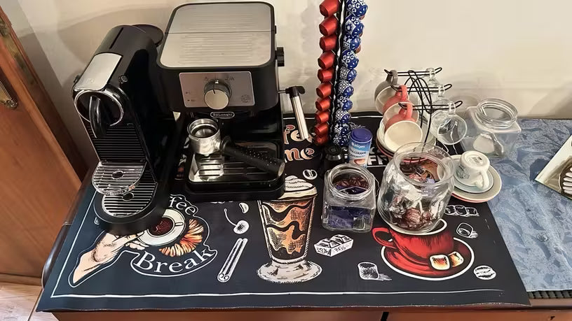 Answer 3: The mat features a vintage hand-painted coffee-themed design, adding a charming aesthetic to your kitchen or bar area.